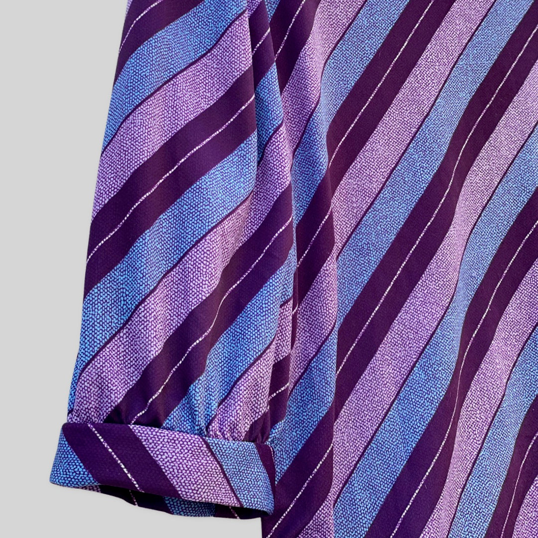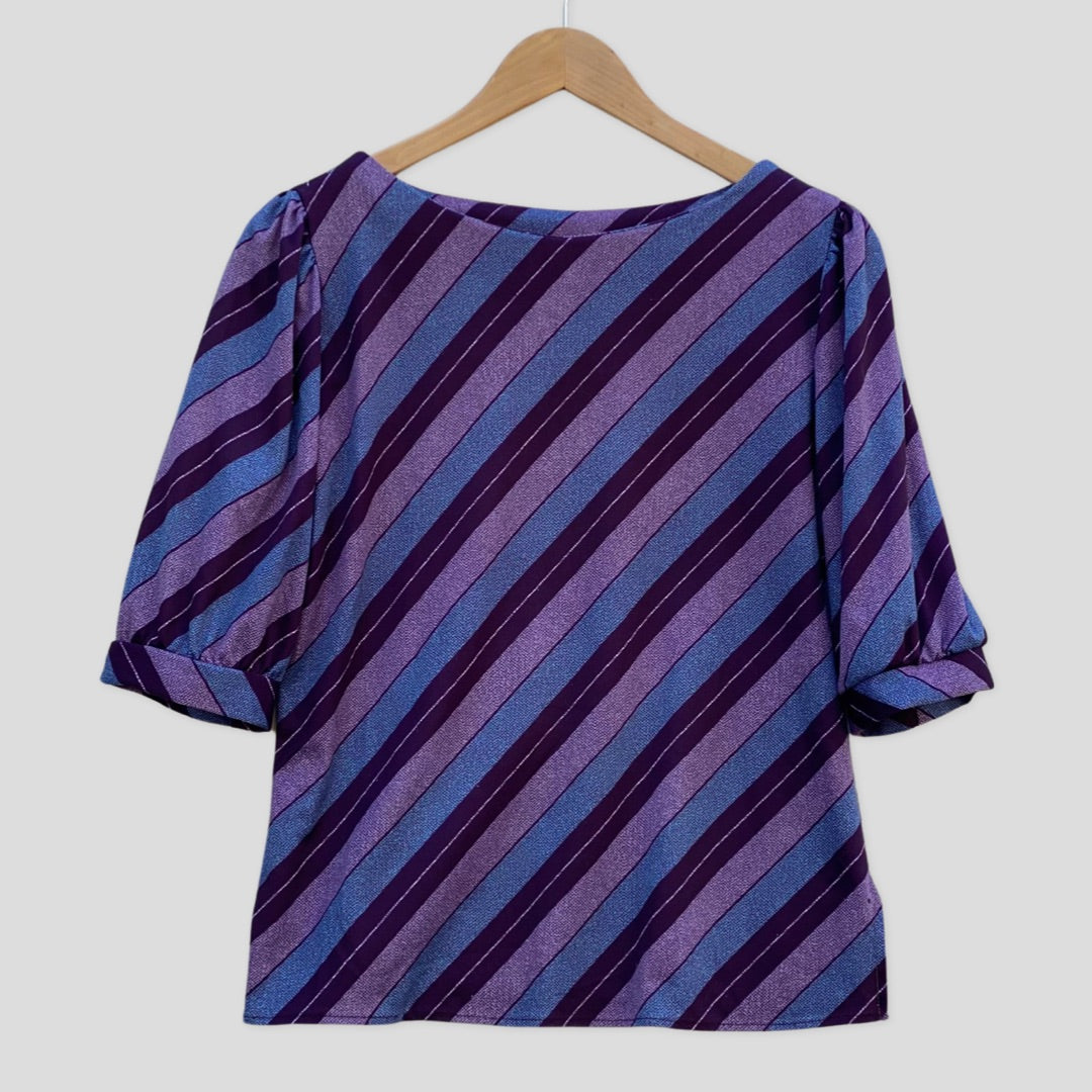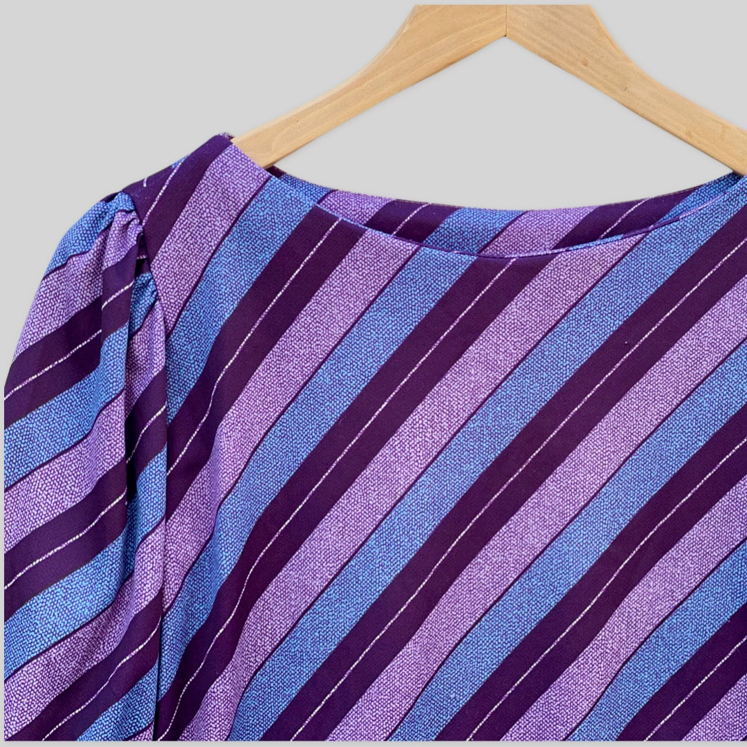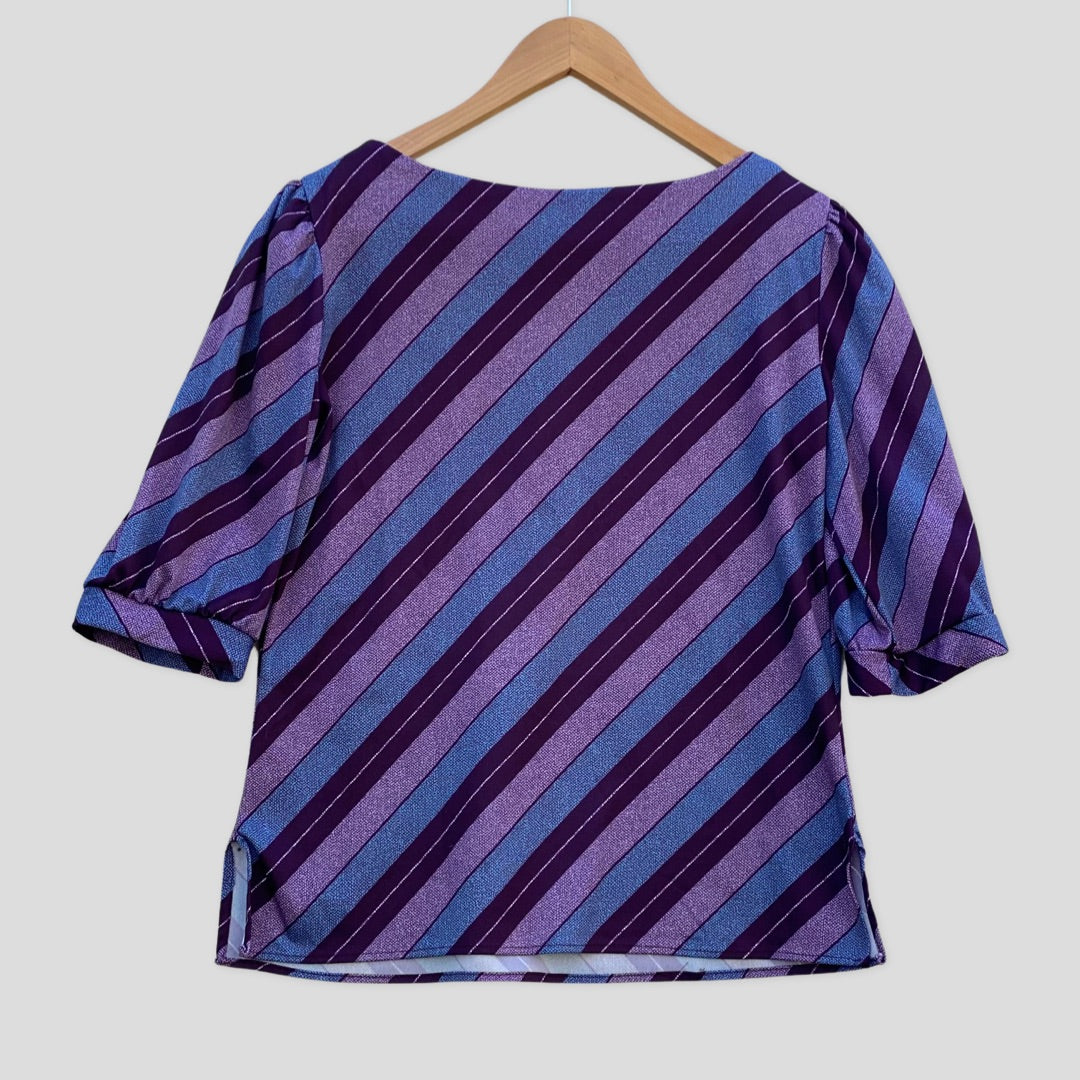 1970-80's Max's Lady top polyester with 3/4 puff sleeve. Iconic stripe design evokes some early eighties vibes.